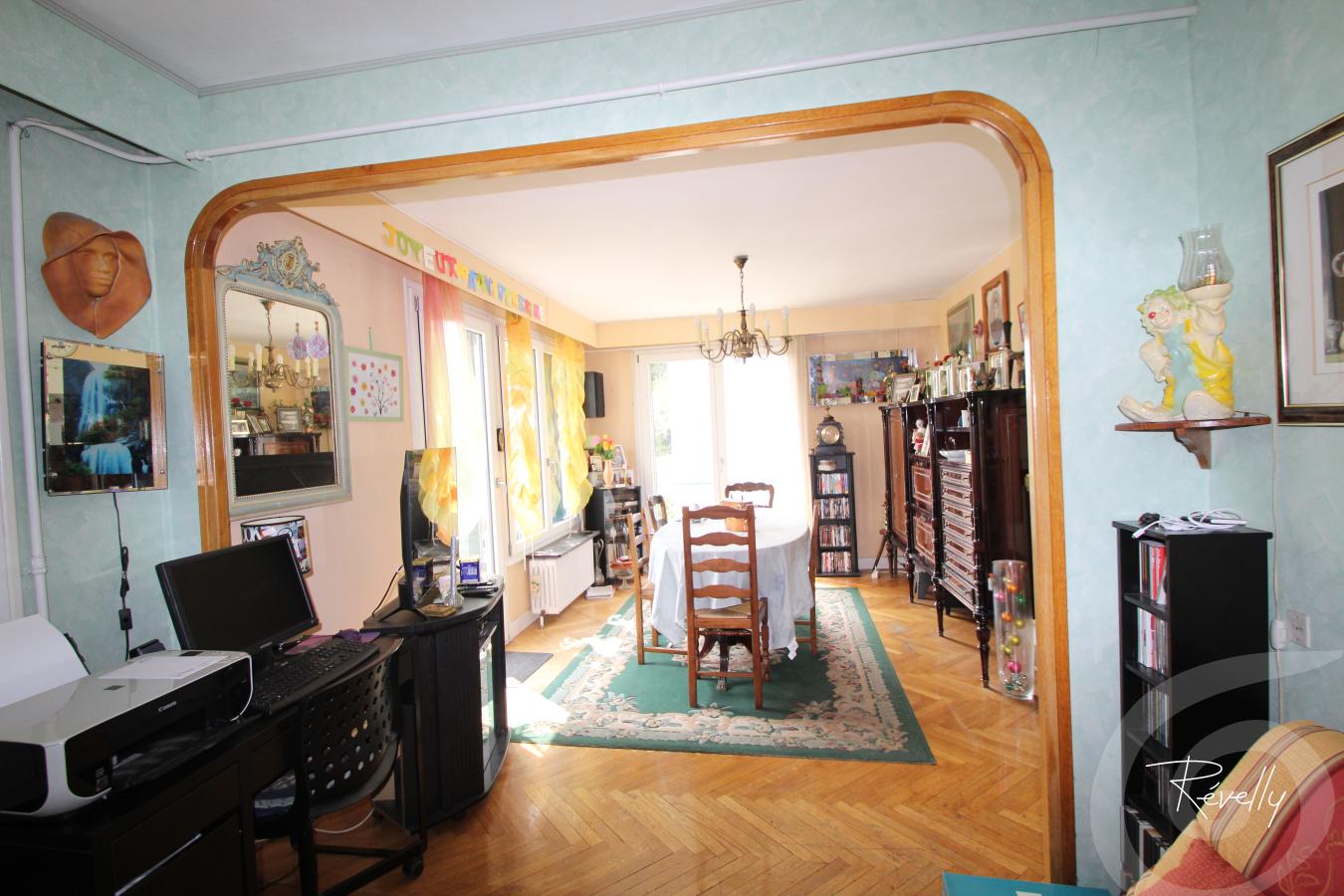 A l'étage : cuisine équipée "ouvrable" sur lumineux salon de 25,08 m² avec balcon périphérique, 2 chambres, salle d'eau, wc et rangements.