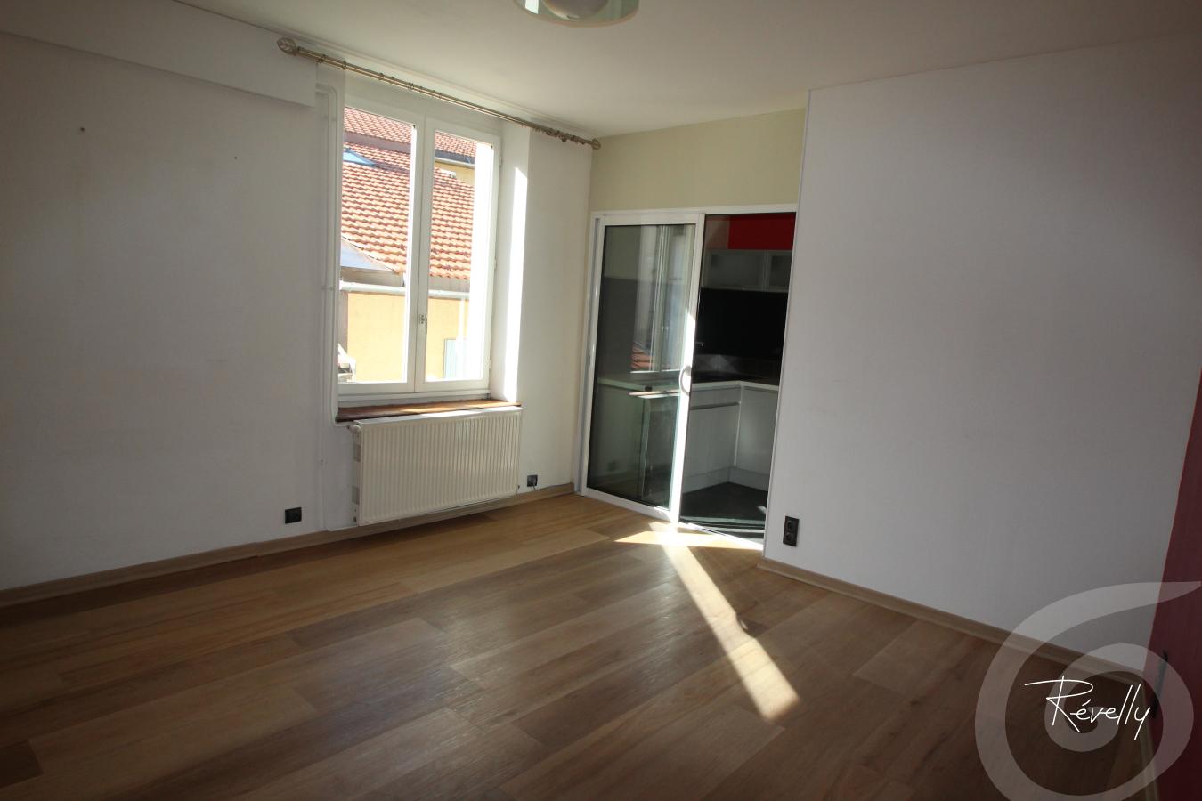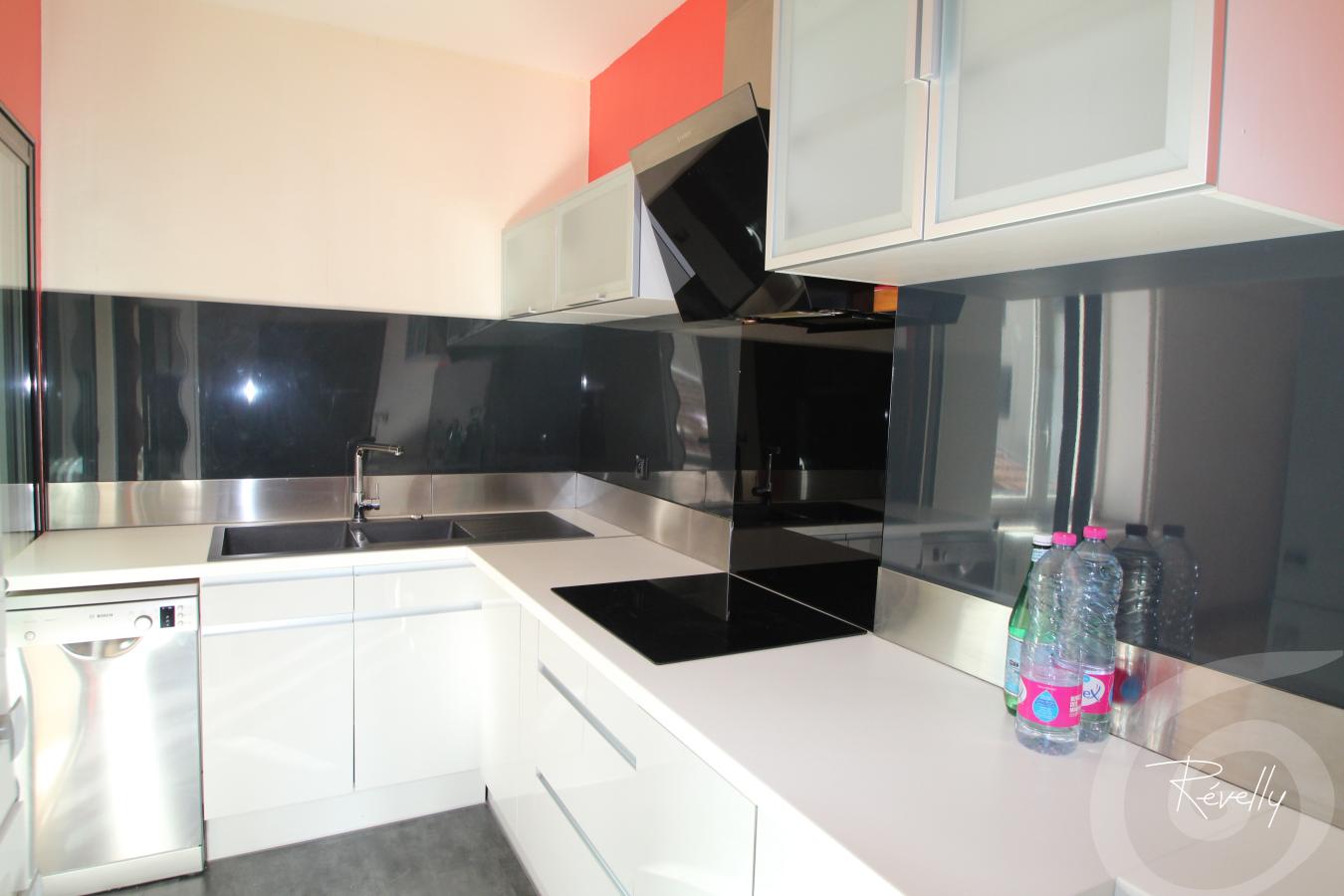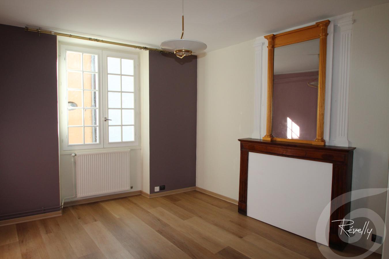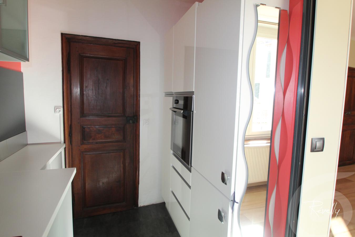 Cuisine entièrement équipée partiellement ouverte sur le salon, chambre spacieuse avec cheminée d'ornement, salle de bains équipée, wc et sanitaire
