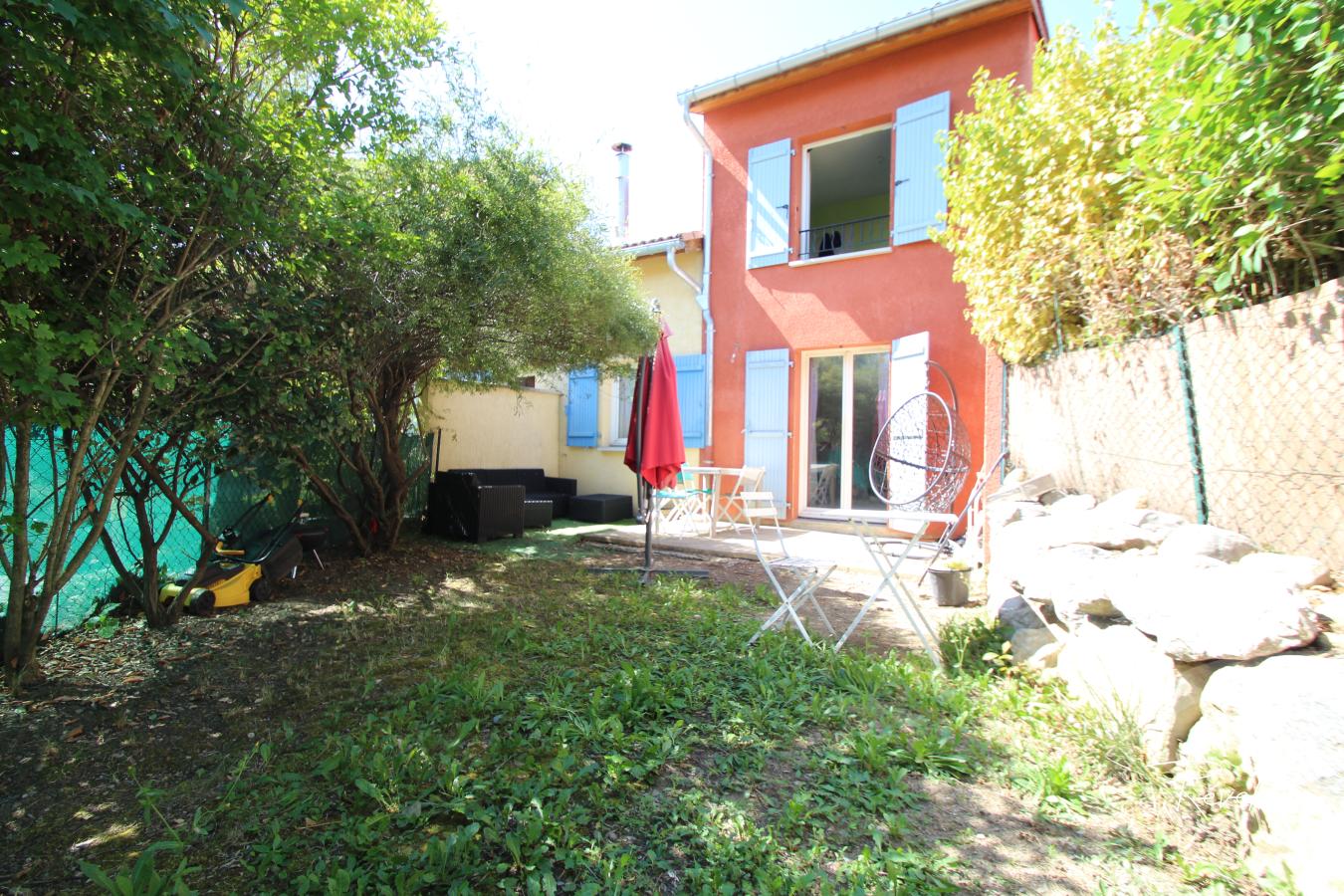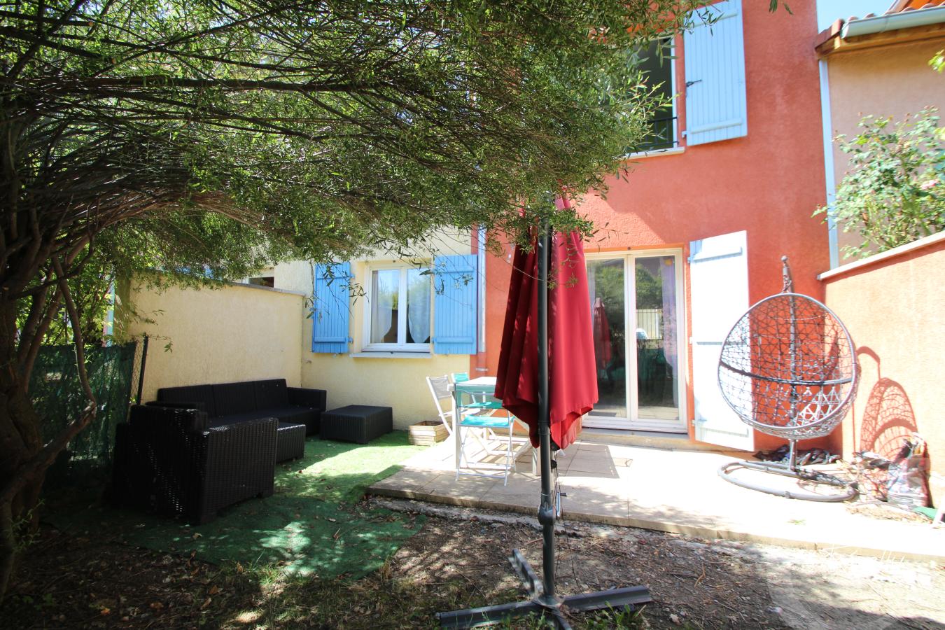 Terrasse ensoleillée prolongée d'un beau petit jardin