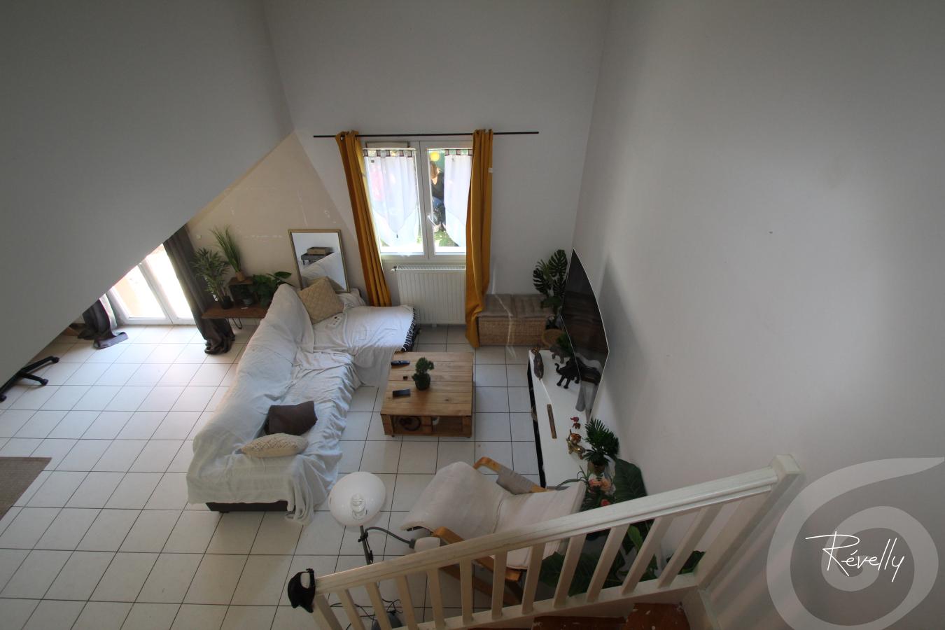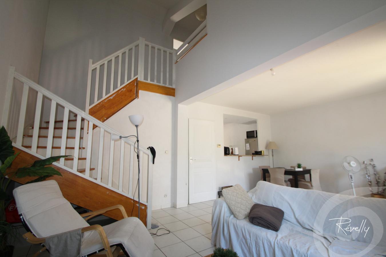 A l'étage : dégagement en mezzanine, 2 chambres avec placard, salle de bain et wc.